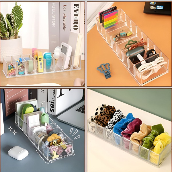 Подвижните разделители на ORGABIN ви позволяват да създавате по-големи или по-малки отделения, в зависимост от вашите нужди. Независимо дали става въпрос за обемисти аксесоари или малки кабели, прозрачният, издръжлив PET материал гарантира, че вашите предмети се съхраняват прилежно и остават видими по всяко време.
