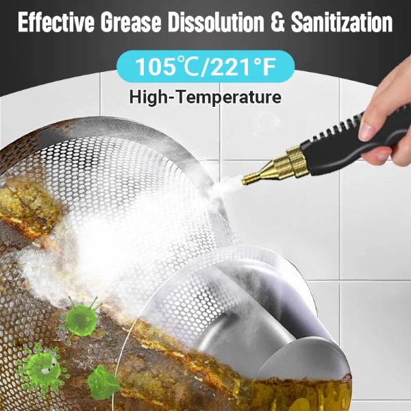 Номиналната мощност от 1600W генерира пара до 105℃ за по-малко от 10 секунди, като бързо премахва мазнини, замърсявания, прах и петна от различни повърхности.