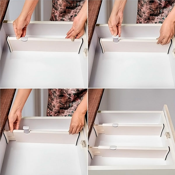 Ще преобразите претрупаните си чекмеджета за секунди. С лесен монтаж „преместване и щракване“ организирането никога не е било по-лесно. Просто поставете, регулирайте и застопорете разделителя на мястото му – не са необходими инструменти или лепило.