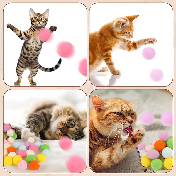 Плюшените топки не издават шум, което позволява на котката ви да играе, без да нарушава спокойствието ви. Изработени от нефлуоресциращ, устойчив на цветовете и мек плюшен материал, те гарантират, че Вашият домашен любимец ще остане в безопасност, докато играе. Тези меки топки са нежни към лапите и зъбите на котката ви, като предотвратяват всякакъв риск от нараняване и осигуряват трайна, дългосрочна употреба.