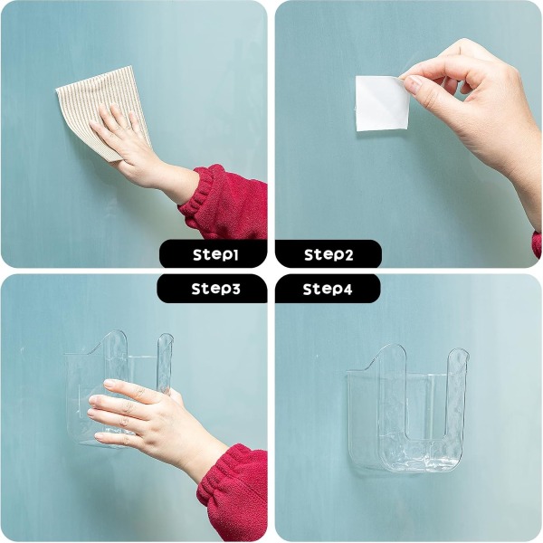 Отлепете залепващата лента, притиснете към стената, готово – без пробиване, без винтове, без инструменти. Държи здраво върху плочки, боядисани стени и вратички на шкафове.