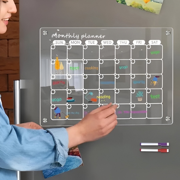 Комплект акрилни календари за хладилник – Месечен + седмичен планер (всеки 40 x 30 см), 4 магнита, сухо изтриване, включени маркери | REUSABLEPLAN